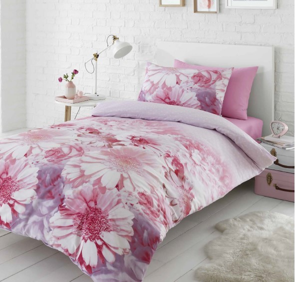 This Duvet set will create a stunning fresh look with the large pink daisy flowers and peony blossoms scattered over a pale lilac polka dot reverse. Duvet set comes with matching pillow case in easy care polycotton fabric.